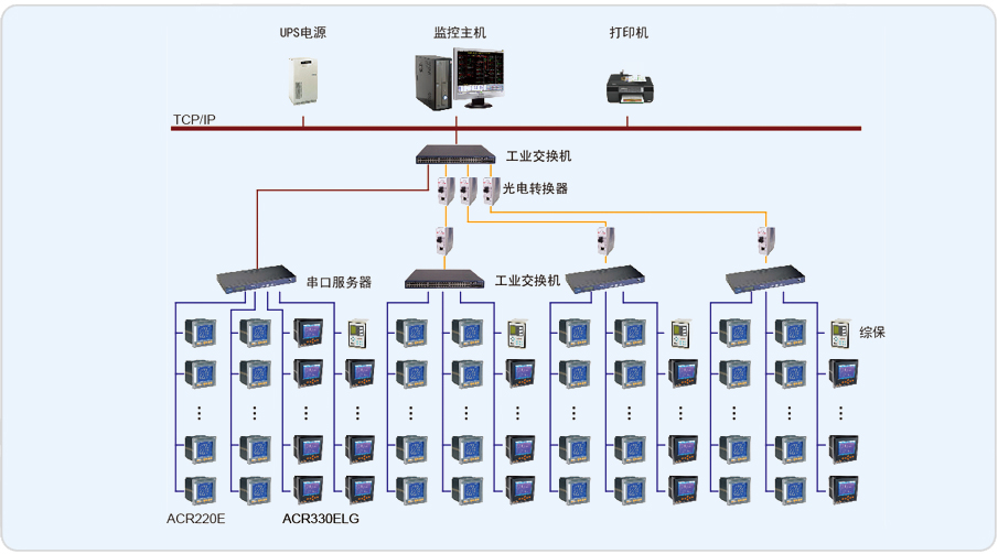 藍(lán)礬化工配電系統(tǒng)管理監(jiān)控系統(tǒng)主要實(shí)現(xiàn)對(duì)藍(lán)礬化工的主控配電室、消防配電室、造氣0.4KV配電室開(kāi)關(guān)柜內(nèi)安裝的213只ACR120EL、11只ACR330ELG、80只電力儀表 、4只綜保的監(jiān)測(cè)和控制。系統(tǒng)通過(guò)安裝在工廠電網(wǎng)中主要受電點(diǎn)和樞紐配電柜中的電能監(jiān)測(cè)儀表采集到配電網(wǎng)的各項(xiàng)電力參數(shù)信號(hào),再將信號(hào)轉(zhuǎn)換為數(shù)據(jù)傳輸?shù)接?jì)算機(jī)中,計(jì)算機(jī)對(duì)數(shù)據(jù)進(jìn)行存儲(chǔ)、計(jì)算和分類存儲(chǔ)到數(shù)據(jù)庫(kù)中,然后通過(guò)計(jì)算軟件將電能以報(bào)表、圖表的形式進(jìn)行展示。電能管理人員可通過(guò)計(jì)算機(jī)看到電能的輸入、傳輸、消耗的全過(guò)程。