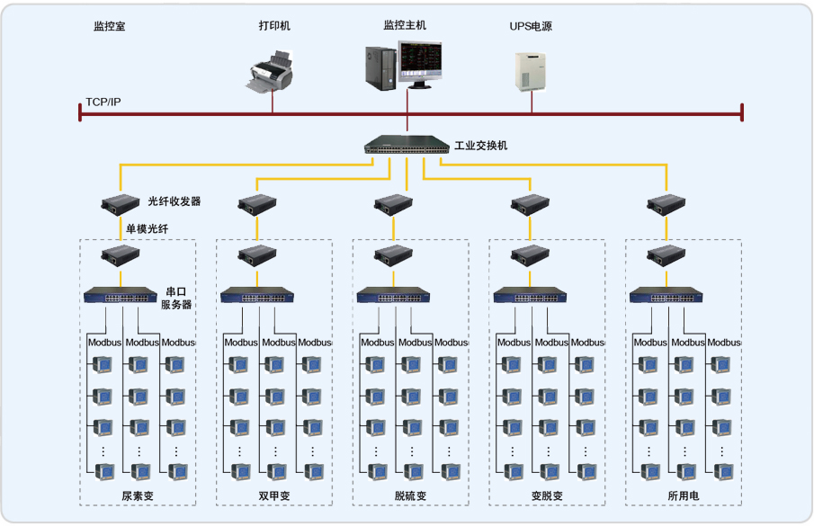 本項目針對現場3個低壓配電室(A、B、C)內安裝的100只左右電力儀表。監控室在A配電室內,B配電室距離A配電室200米左右,儀表為20只左右。另一個C配電室距離A配電室600米左右,儀表為40只左右。